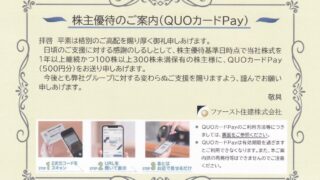 株主優待 8917 ファースト住建 優待内容4,10月権利1年以上で 100株はクオカード 500円、300株は手延素麺揖保乃糸です。前回はクオカードPayでしたが、次回はクオカードなのでしょうか。指標2026/3/27終値 1,174円PER 10.8倍PBR 0.40倍R... 2026.04.01 株主優待
