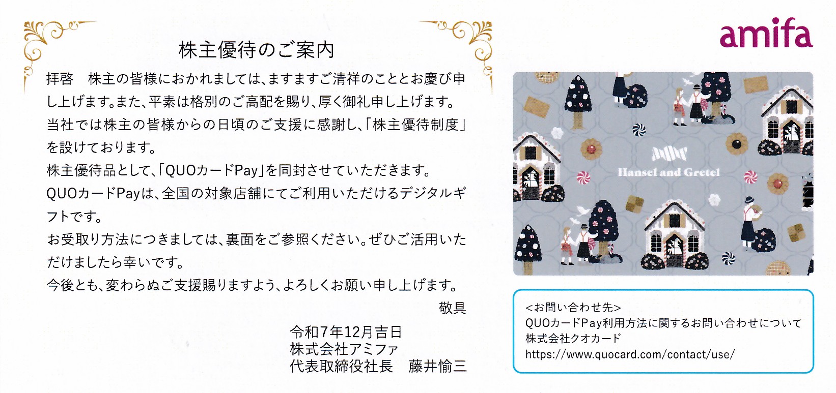7800 アミファ 株主優待 2026.03.10 目次 優待内容指標感想 優待内容 9月権利3年以上でQUOカードPay 1,000円です。 アミファからクオカードPay 1000円 pic.twitter.com/yRPqmsF3wh— バヤン (@bayankabu) December 10, 2025 指標 2026/3/6終値 1,528円PER 12.2倍PBR 2.10倍ROE 9.6%自己資本比率 58.3%配当利回り 1.70%優待利回り 0.65% 感想 優待までに3年は長いですね。つい最近利確しました。4年で 2倍以上とかなり効率の良い投資となりました。その時からほとんど株価は動いていないですね。
