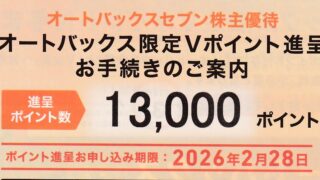 株主優待 9832 オートバックスセブン 優待内容3,9月権利1年以上の保有で、オートバックス限定Vポイントです。有効期間はポイント付与日から1年間です。100株 1年以上 1,000円300株 1年以上 3,000円 700株 1年以上 7,000円 3年以上 8,000円1,0... 2026.01.17 株主優待
