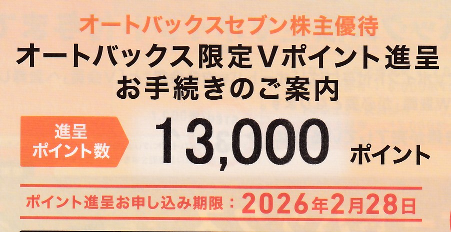 3,9月権利1年以上の保有で、オートバックス限定Vポイントです。有効期間はポイント付与日から1年間です。