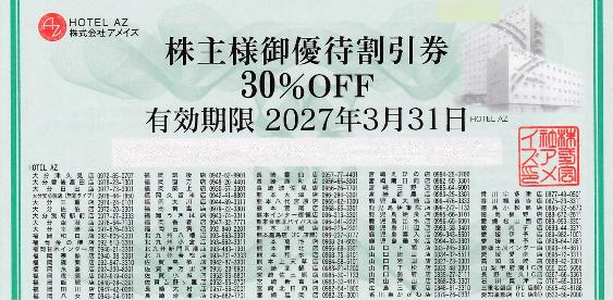 6076 アメイズ 株主優待 2026.04.16 目次 優待内容指標感想 優待内容 11月権利で、宿泊料金30%割引券5枚 アメイズから30%宿泊割引券。使う機会はない。 pic.twitter.com/pRj2M6C8RB— バヤン (@bayankabu) March 2, 2026 指標 2026/4/10終値 1,219円PER 7.4倍PBR 0.99倍ROE 13.3%自己資本比率 52.1%配当利回り 2.87% 感想 郊外型のビジネスホテルが多く、優待は使い辛いです。車移動なら使えそうです。