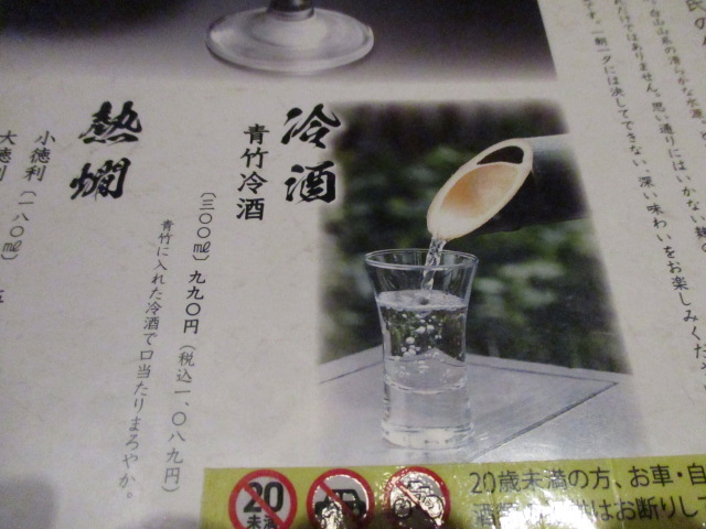 青竹に入った冷酒を注文。趣はありますが、味は期待ほどには感じませんでした。