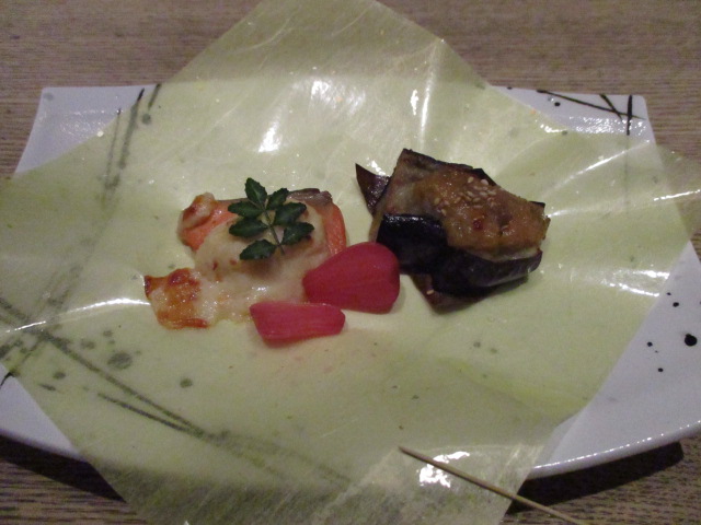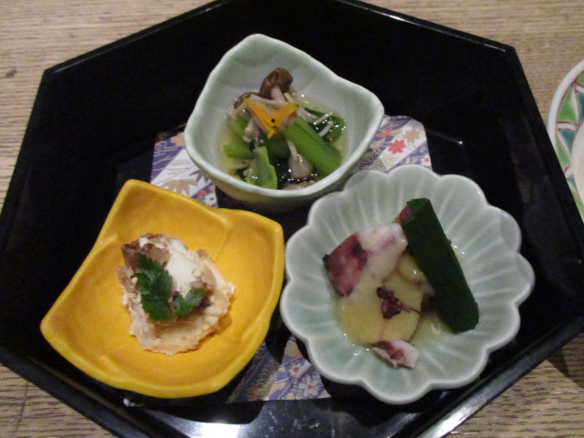 焼き物。宿での夕食だと、この辺りで量の多い物が出てくるけど、ボリュームのある品はありませんでした。妻はこれくらいの量で充分と言います。確かにその通りかも。足りなければ追加すれば良い。