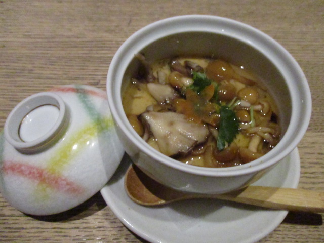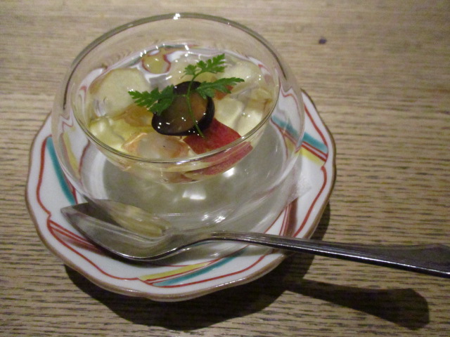 先付のゼリー寄せと前菜です。前菜の覆いを除いたものが右画像です。