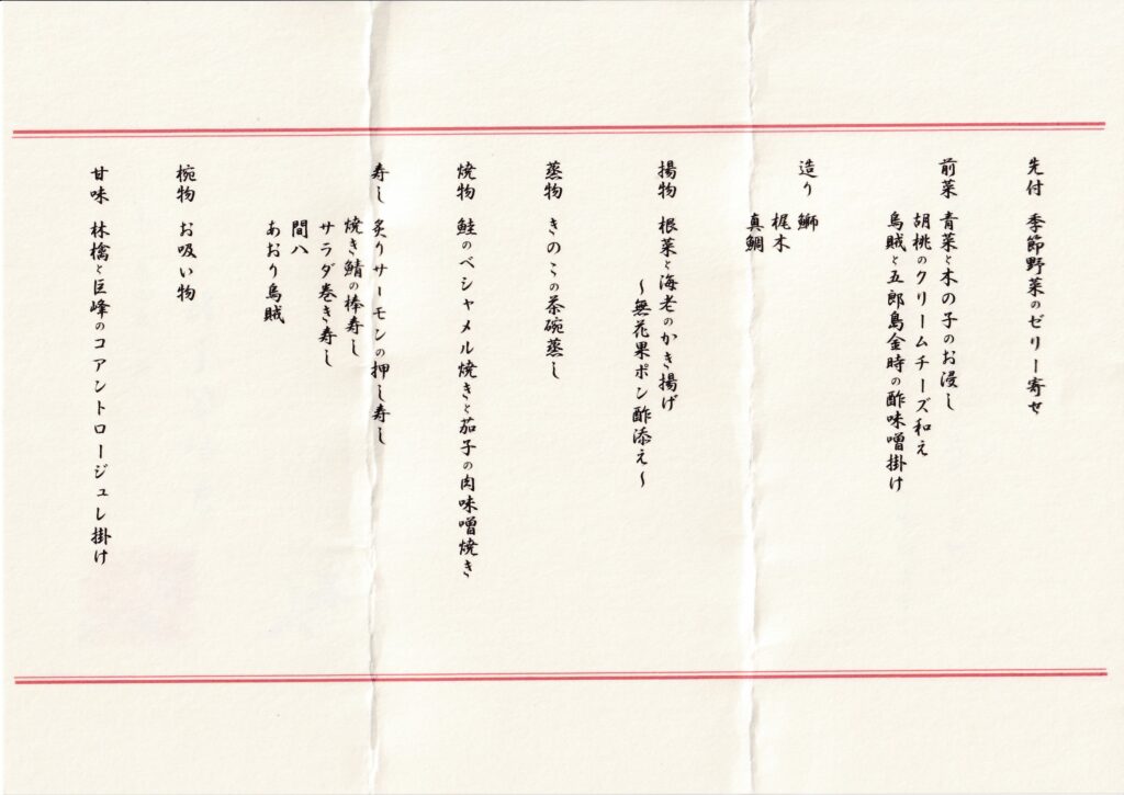 お店の手配は全て妻に任せてありますので詳細は知らないのですが、4,000円(+税) のコースだそうです。下の画像が献立です。