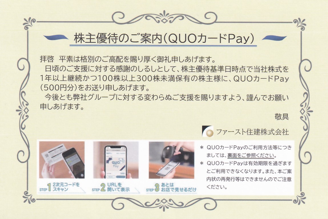 8917 ファースト住建 株主優待 2026.04.01 目次 優待内容指標感想 優待内容 4,10月権利1年以上で 100株はクオカード 500円、300株は手延素麺揖保乃糸です。前回はクオカードPayでしたが、次回はクオカードなのでしょうか。 ファースト住建からクオカードPay 500円 pic.twitter.com/jCYvKvrSGG— バヤン (@bayankabu) January 28, 2026 指標 2026/3/27終値 1,174円PER 10.8倍PBR 0.40倍ROE 3.5%自己資本比率 65.8%配当利回り 3.66%優待利回り 0.85% 感想 好財務、低PBR、高利回りの銘柄です。配当優待をもらいながら、PBRの是正をのんびり待ちます。