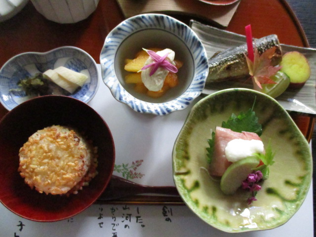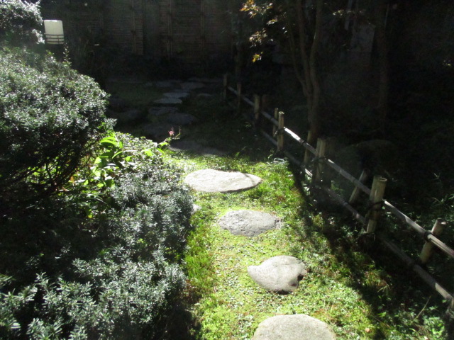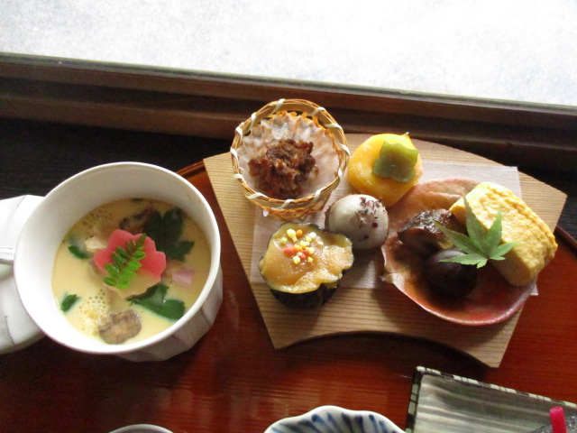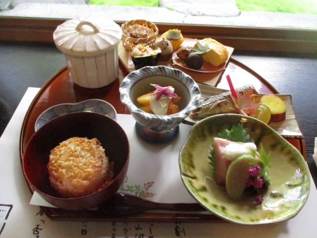 到着が少々早過ぎたため、庭などを見ながら待ちます。下の左画像は待っている時の風景。右画像は食事の時に見える風景。私たちは庭が正面に見える席での食事でした。