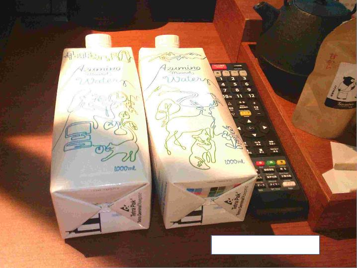 水はパック牛乳みたいな容器での提供。Water と書いてあるから分かったけど、妻は気付かなかった。