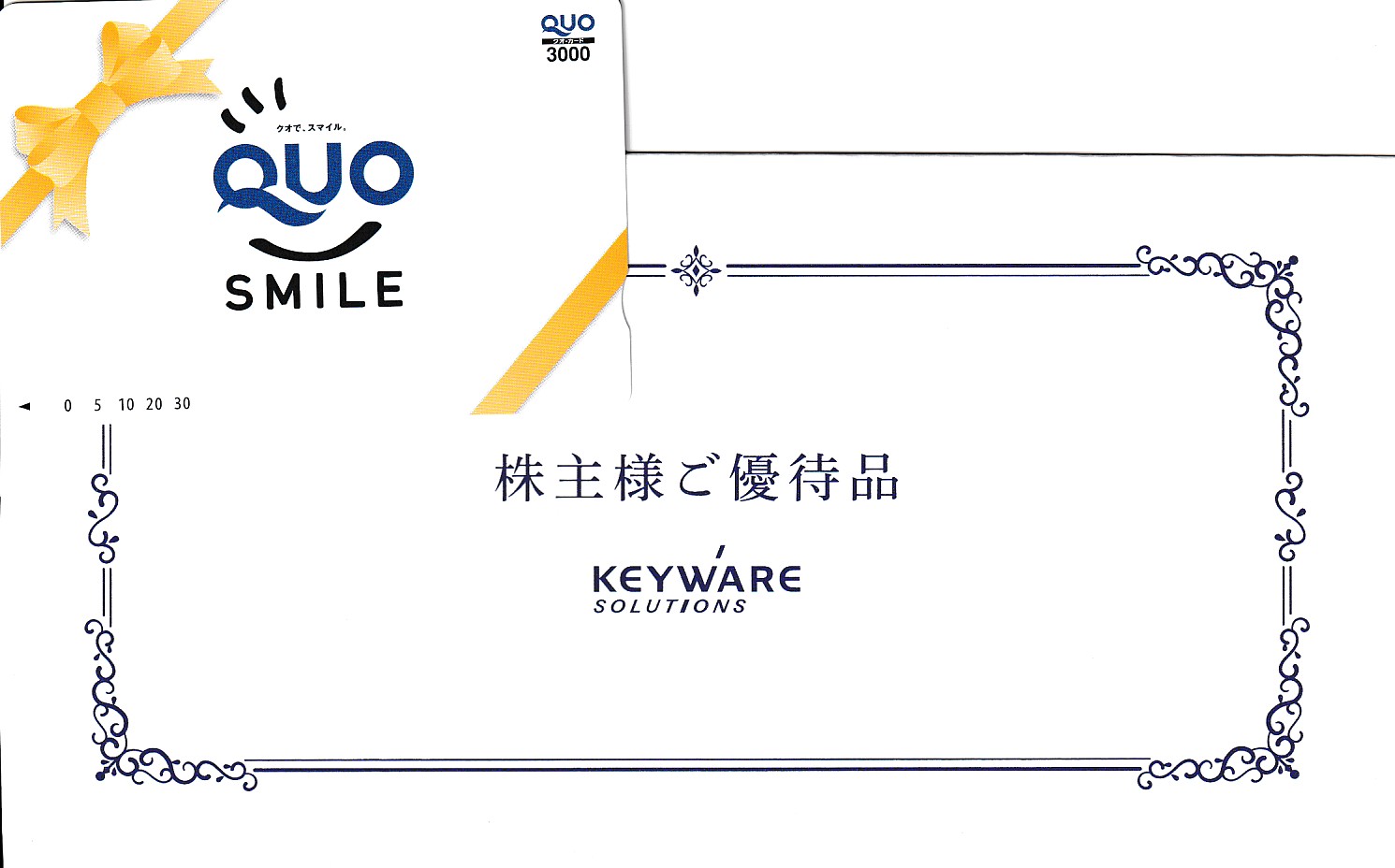 3799 キーウェアソリューションズ 株主優待 2026.02.26 目次 優待内容指標感想 優待内容 3,9月権利、300株半年以上の保有で 3,000円のクオカードです。 キーウェアからクオカード pic.twitter.com/CR7OeywGyd— バヤン (@bayankabu) December 9, 2025 指標 2026/2/20終値 1,174円PER 12.2倍PBR 1.29倍ROE 12.2%自己資本比率 71.4%配当利回り 2.89%優待利回り 1.70% 感想 有利子負債がありません。連続増配中です。この業績が維持されるなら、優待がなくても十分投資対象になりそうですね。