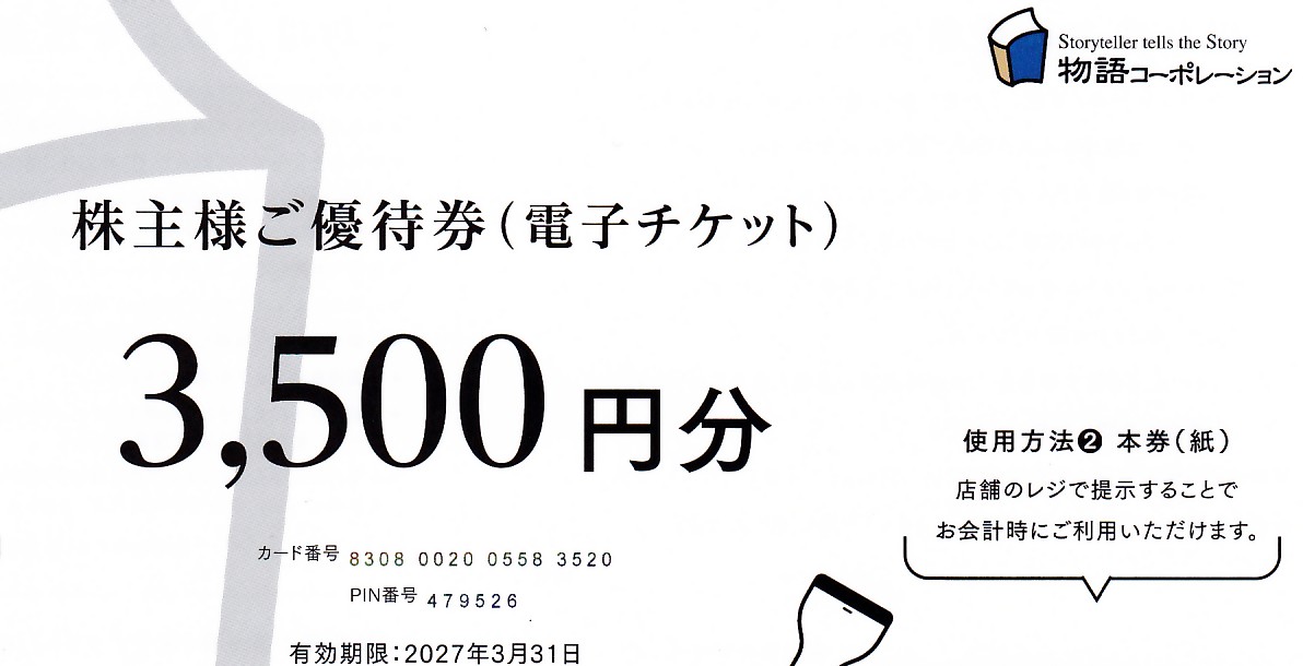 3097 物語コーポレーション 株主優待 2026.04.18 目次 優待内容指標感想 優待内容 6,12月権利半年以上で 優待券 3,500円相当です。焼肉きんぐが人気のようです。我が家はゆず庵で消費しています。 物語コーポレーションの優待カードが電子化。紙のままでも利用可。最近は両親をゆず庵に連れて行って1回で消費しているので、紙のままでいいや。 pic.twitter.com/snpJgpTgw2— バヤン (@bayankabu) March 10, 2026 指標 2026/4/10終値 4,470円PER 23.1倍PBR 3.99倍ROE 17.7%自己資本比率 52.2%配当利回り 0.89%優待利回り 1.56% 感想 連続増配中です。ROEは 20%前後で推移しています。利回りは低いですが、成長銘柄として保有し続けます。優待は店舗が近くないので、持て余し気味です。