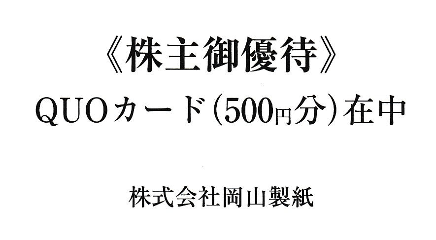 3892 岡山製紙 株主優待 2025.11.24 目次 優待内容指標感想 優待内容 5月権利でクオカードです。 100株 500円 500株 2,000円 1,000株 4,000円 岡山製紙からクオカード 500円 pic.twitter.com/XVF6Bwq95T— バヤン (@bayankabu) August 29, 2025 指標 2025/11/14終値 1,554円PER 10.3倍PBR 0.53倍ROE 6.3%自己資本比率 78.0%配当利回り 3.21%優待利回り 100株 0.32% 500株 0.25% 1,000株 0.25% 感想 有利子負債がありません。連続増配中です。PBR がかなり低いです。今後の増配を期待すると、今の利回りより評価すべきかもしれません。