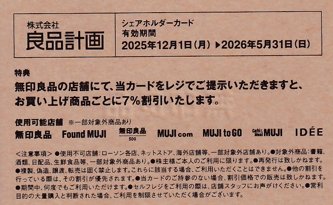 7453 良品計画 株主優待 2026.01.24 目次 優待内容指標感想 優待内容 2,8月権利で 7%割引券です。何回でも利用できます。妻が無印良品でフル活用しています。 良品計画から 7%割引カード pic.twitter.com/8GWFfFEvPr— バヤン (@bayankabu) November 27, 2025 指標 2026/1/16終値 3,170円PER 31.7倍PBR 4.58倍ROE 16.2%自己資本比率 59.0%配当利回り 0.88% 感想 株価は絶好調ですでに割高に感じますが、妻が優待を利用するので利確できません。