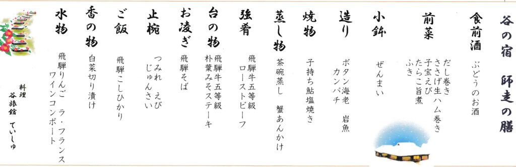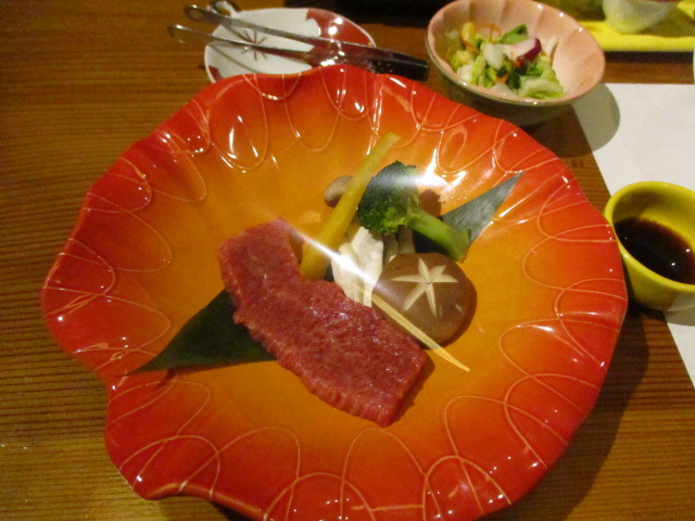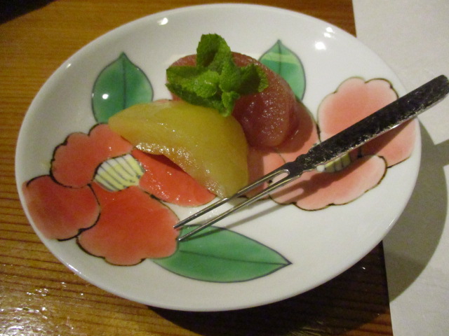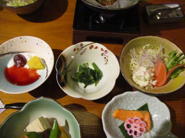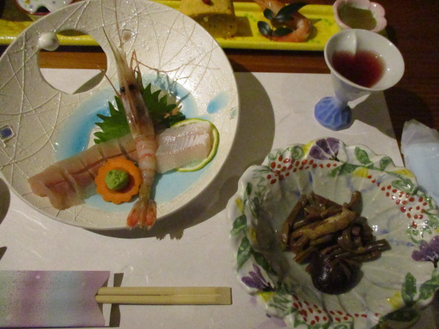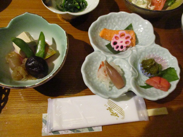 食前酒、小鉢、造りです。造りが気に入りました。川魚は岩魚だけですが、山の食材のみでお造りを充実させるのは難しいので、これで良いと思います。