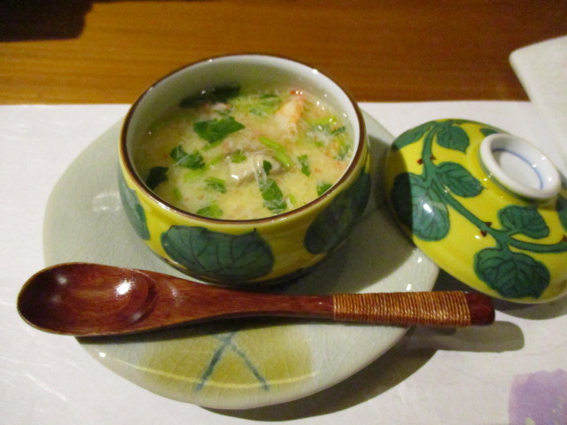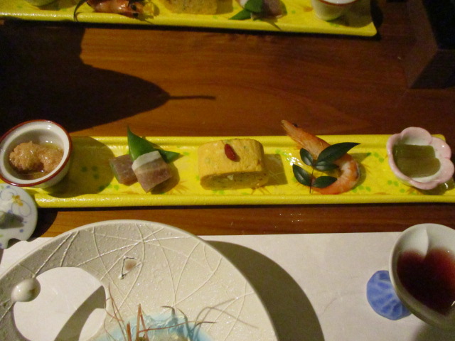 前菜。子宝えびは背にキャビアっぽいものが挟まれています。生ハムが美味しかった。