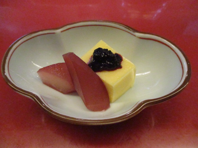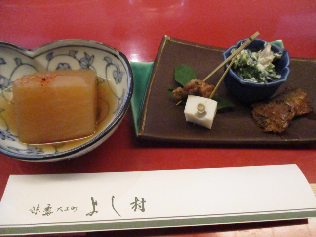 金沢旅行2日目の夜は金沢の中心街 片町 にある 吉村 を訪れました。ホテル以外は全て妻の好きなようにさせていますので、予約内容などは詳しく知らないのですが、総額で2万円余りだったそうです。飲み物は日本酒1合、エビスビール1本、ウーロン茶一杯を含みます。お任せコースですが、地元の野菜を中心にするよう要望したそうで、加賀野菜がふんだんに盛り込まれていました。
