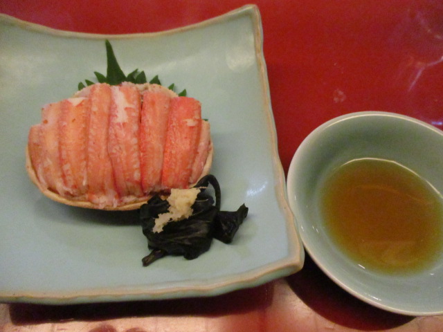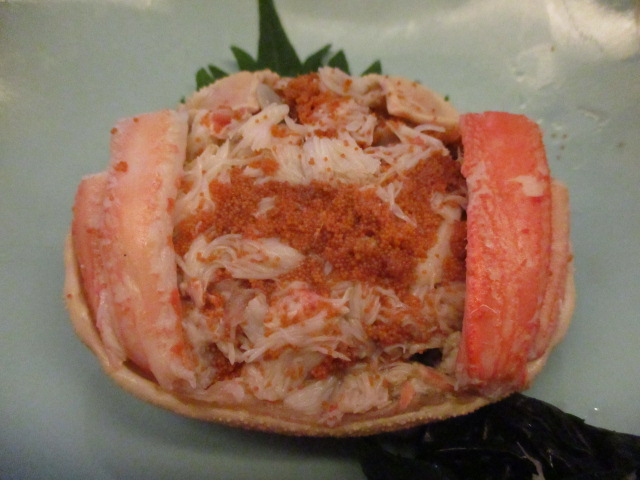 香箱蟹です。過去の記録を見ると、伊豆にある共立リゾートの米屋(淘心庵 米屋 ③ 夕食)で食していますが、豪華さが全然違います。上に乗っている蟹の身を食べると、下にはほぐした身がいっぱい。この画像では見えませんが底には卵があります。この時期に来たおかげでしょうか。
